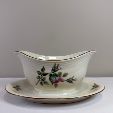 Modellen har en renere hvitfarge enn mange andre 50-tallsserviser og er dekorert med små, elegante blomsterbuketter i rosa og gråtoner samt gullkant. Et typisk etterkrigsdesign – lett, stilrent og dekorativt.
