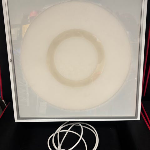 LIFX Tile LED lyspanel. Mangler strømforsyning og første kabel, sistnevnte er der enda men kan loddes sammen igjen. Firkantede paneler med integrert LED-lys, beregnet for innendørs bruk. Panelene kan monteres sammen i serie og styres via tilkoblet strømledning. Lyset kan vises i ulike farger, som for eksempel blå og rosa, og egner seg til dekorativ belysning på vegg eller andre flate overflater i hjemmemiljøer. Produktet er merket for innendørs bruk og har nødvendige sikkerhets- og sertifiseringssymboler på baksiden.