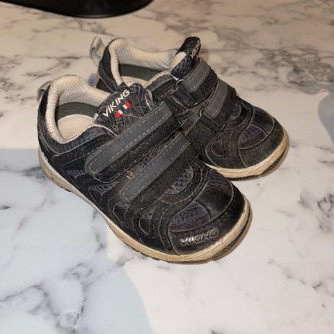 Viking barnesko i størrelse 23, unisex. Skoene er i hovedsak svarte med mørke detaljer og har to borrelåsremmer over vristen for enkel justering og av- og påtaking. Overdelen er i tekstil og syntetisk materiale, og yttersålen er i gummi med mønster for godt grep. Egnet som hverdagssko til barn i størrelse 23.