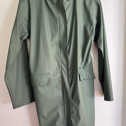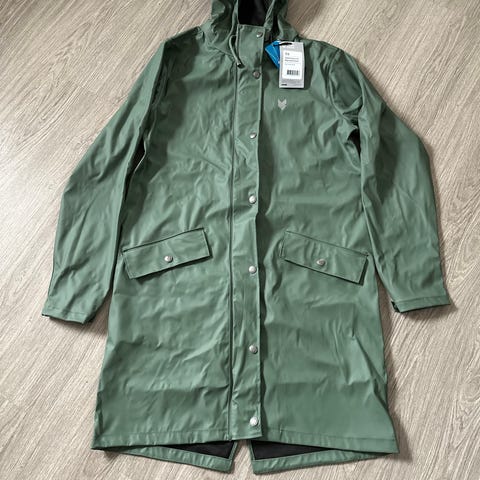 Jakke som går til rumpen, reflex detaljer. Lommer med knapp, glidlås og knapper for å slippe og bli våt i midten. Romslig hette