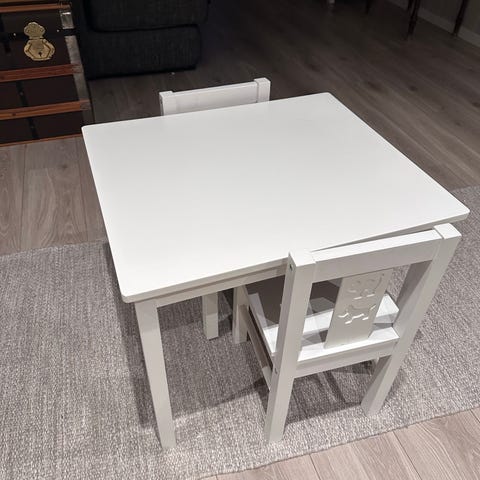 IKEA barnesett med bord og to stoler i tre og hvit overflate. Bord og stoler har ramme i treverk med hvit bordplate og sitteflate. Settet passer til barn til lek, tegning, måltider og andre aktiviteter. Nøytral fargekombinasjon som gjør at det enkelt kan plasseres på barnerom, stue eller lekerom.