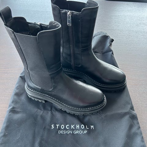Ubrukte Stockholm Design Group støvletter i størrelse 38 selges da de dessverre er kjøpt i feil størrelse. Støvlettene har kraftig såle og glidelås på siden for enkel av- og påtaking. Elastisk felt på skaftet for bedre passform. Nøytral modell som kan brukes til hverdags og fritid i kjøligere vær. Skoeske følger med. Ny pris 2000,-
