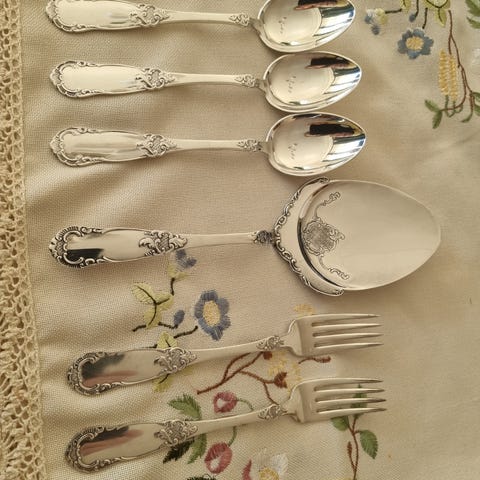 Selger pent brukt sølvplett bestikk i Panser mønster designet av Theodor Olsen. Noe av bestikket er allerede solgt. Men dette er hva jeg har igjen.