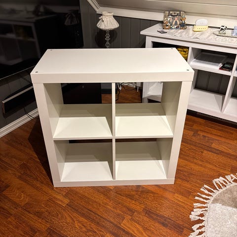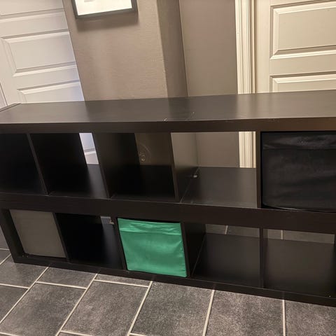 En mørke brun 4 roms kallax hylle, den har ett feste i venstre nederste hylle. Bruksmerker kan forekomme.