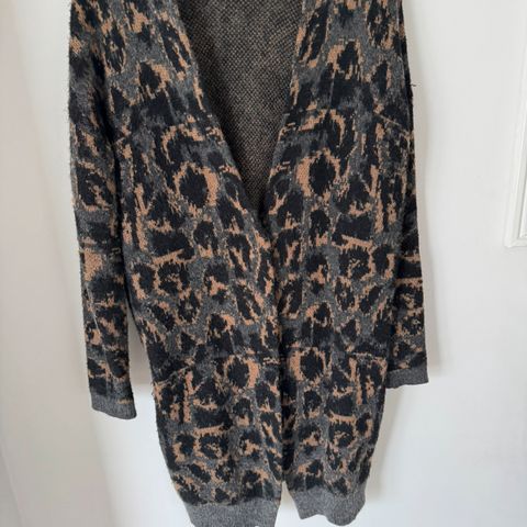 DAY Birger et Mikkelsen cardigan for dame i størrelse M. Cardiganen er flerfarget med mønster og motiv på ryggen. Den er laget i polyesterblanding ifølge vaskelappen, med myk og strikket struktur. Åpen front uten lukking og lange ermer. Passer som et lett ytterlag eller som ekstra lag over topp eller kjole.