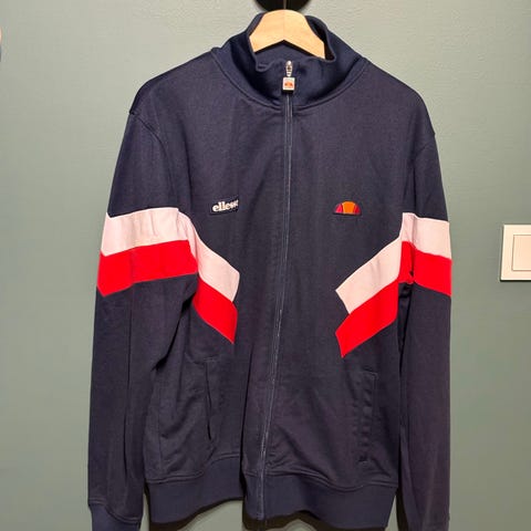 Ellesse Rimini track jacket i størrelse L (UK L). Sort overdel med grønn underdel og hvite striper over bryst og ermer. Brodert logo foran og “Rimini” brodert bak i kragen. Glidelås i front og høy hals.