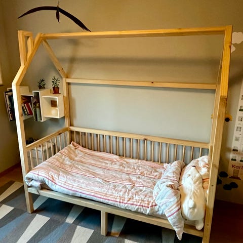 JLY juniorseng i tre med regnbuemotiv i hodeenden. Sengen har avrundede gavler og en liten sengehest på den ene siden for økt trygghet. Ribbe-bunn i tre gir støtte til madrassen. Mål ca. 204 x 94 x 70 cm (L x B x H), egnet for barn som har vokst ut av sprinkelseng. Designet for standard juniormadrass (madrass medfølger vanligvis ikke). Nøytrale naturtoner med fargede buer i hodeenden gjør at sengen passer inn på de fleste barnerom.