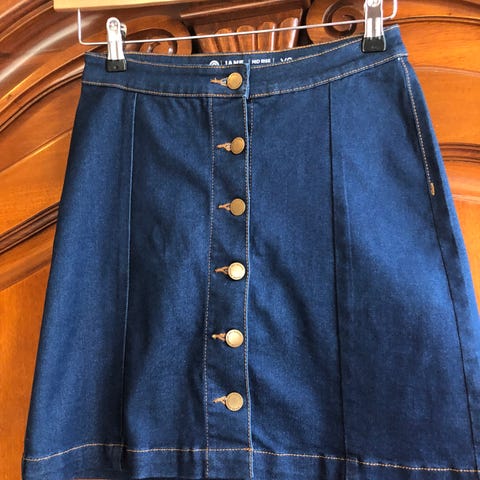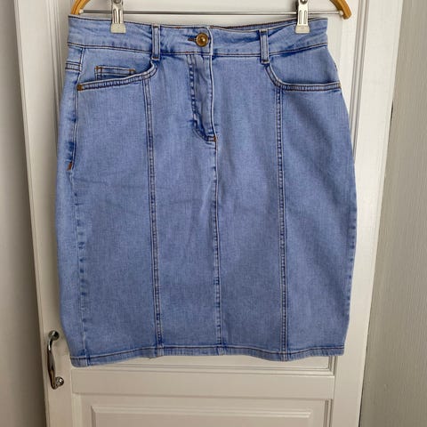 Cubus Jane skjørt i denim for dame i størrelse XL. Skjørtet er i blå denim med knappelukking foran. Mid waist-modell med klassisk jeans-søm og beltehemper. Passer til hverdagsbruk og kan kombineres med ulike topper og gensere.