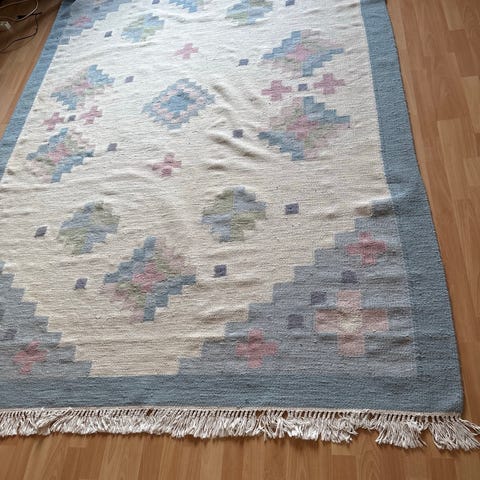 Selger et flott Röllakan ullteppe i klassisk, flatvevd kvalitet. Teppet kan brukes på begge sider.