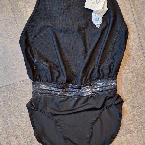 Grishko dansebody for dame i størrelse M. Bodyen er svart og har blondeparti øverst med blomsterdetaljer og meshfelt. Modellen har smale stropper og er laget i elastisk materiale som gir bevegelsesfrihet til dans og annen scenisk aktivitet. Egnet som treningstøy eller kostyme til ulike dansestiler.