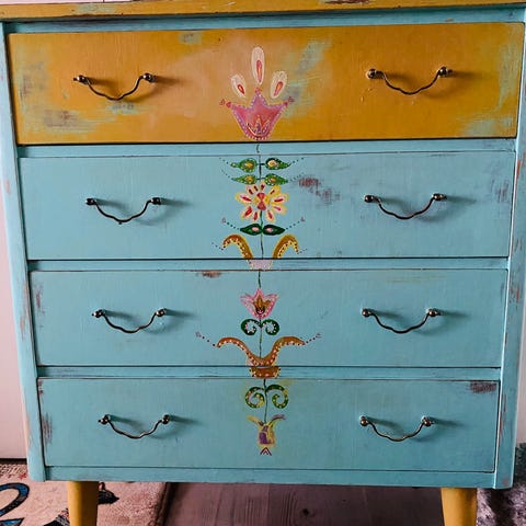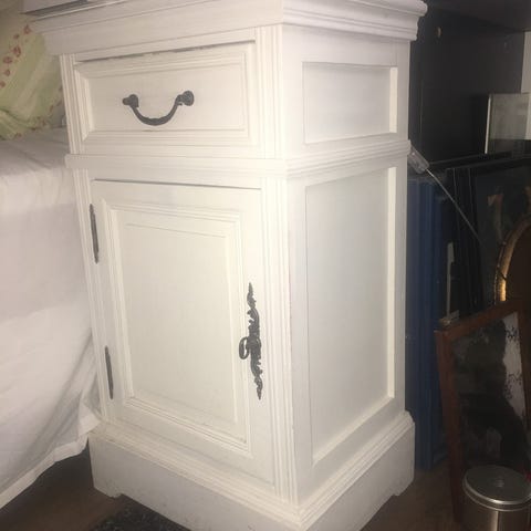 Kommoden står nå på badet og må demonteres for å få den ut. Jeg kommer til å demontere den før henting, siden vi allerede har nye hyller som skal opp. Skuffene tas ut enkelt, men selve stammen er massiv og tung.