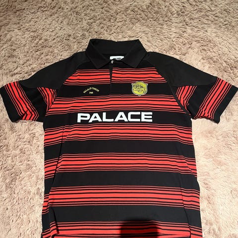 Strikket half zip fra Palace i størrelse L. Tydelig mønster i burgunder, navy, oransje og krem med brodert Palace logo på brystet og sort krage med glidelås.