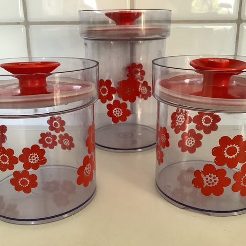 Containere med lokk i klar plast med brunt lokk og brunt blomsterdekor