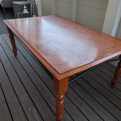 Rektangulært spisebord i tre med brun overflate. Bordplaten har et rustikt preg med synlige sjatteringer i treverket. Bordet har fire ben i mørkere tre som gir en tydelig kontrast til bordplaten. Egner seg som spisebord stue eller hytte. Størrelse . Støtte beslag i jern ikke påmontert men medfølger. Mål Lxbxh: 163x76x51cm