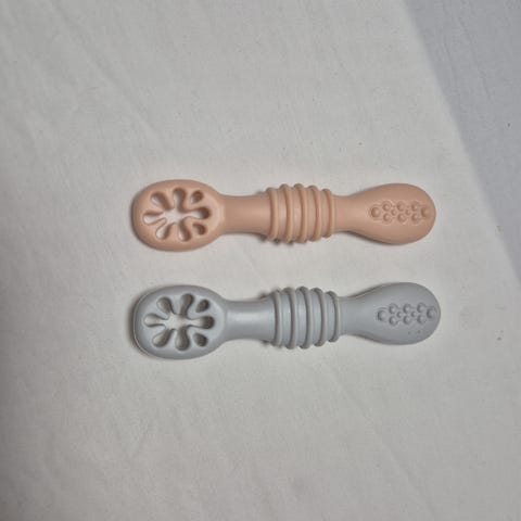 Silikon skjeer fra min spire til baby i to farger, grå og rosa.