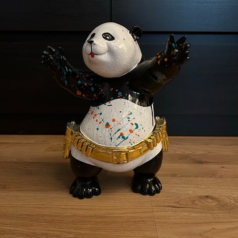 Dekorativ figur formet som en ape med krone og ryggsekk. Figuren er hovedsakelig svart med gullfarget krone og hvit ryggsekk med sort motiv på for- og bakside.