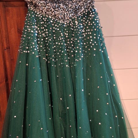 Helt ny ballkjole i svart , men ble for liten for min datter . Nydelig kjole med split . Ikke brukt , ny .