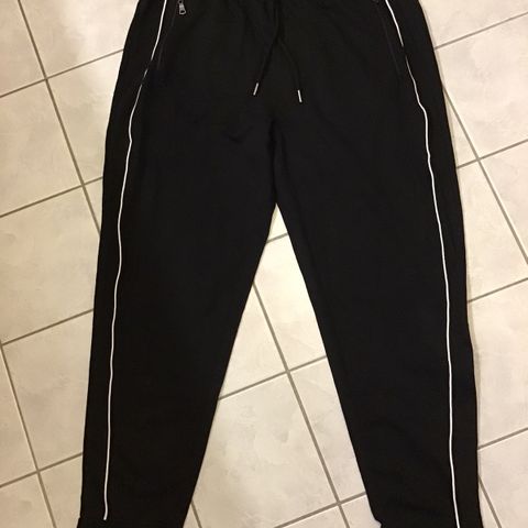 joggebukse i unisex størrelse XL. Buksen er svart og har strikk og snøring i livet for justerbar passform. Ribbestrikkede mansjetter nederst på bena gir en smal avslutning ved anklene. Egnet som fritids- eller treningsbukse. Materialet fremstår som lett og mykt, egnet til hverdagsbruk og enkel aktivitet.
