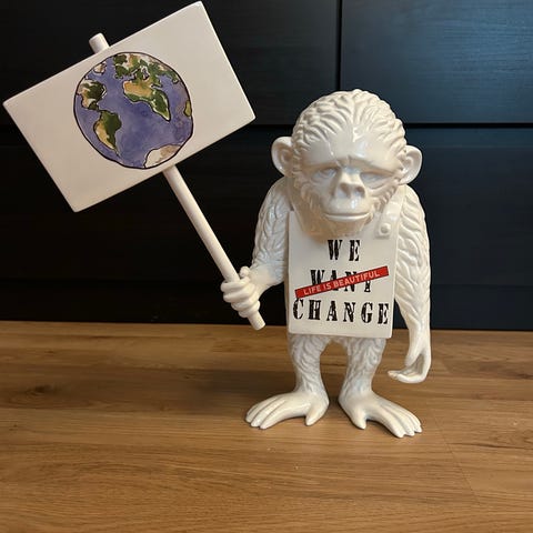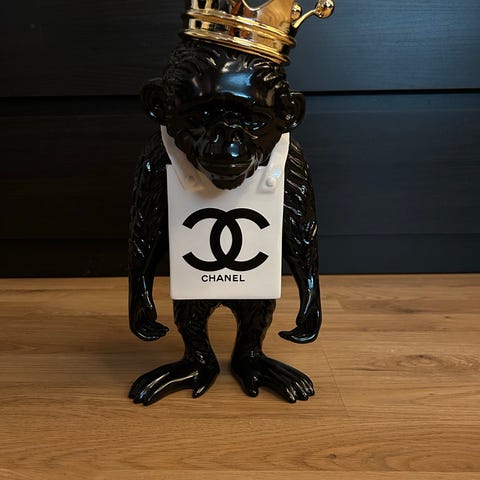 Panda figur i dekorativ utførelse. Figuren forestiller en stående panda med armene løftet. Overkroppen er hvit med fargede malingsflekker, mens hode, armer og ben er svarte. Rundt midjen har figuren et mark gull belte.