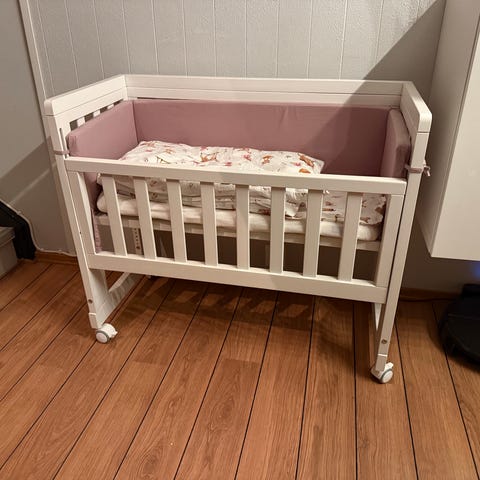 Stokke bedside crib barneseng. Frittstående babyseng som kan plasseres inntil voksenseng. Hvit seng med treben og hjul.