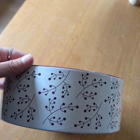 Trixie matskål til hund eller katt i svart og grå farge. Skålen har potetrykk på utsiden og ensfarget innside. Egnet til både tørrfôr, våtfôr og vann. Passer for mindre til mellomstore kjæledyr, som hund eller katt. Holder 300ml og er 12cm diameter.
