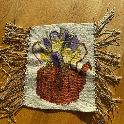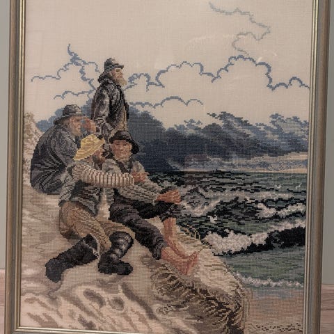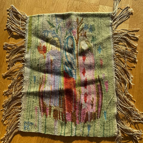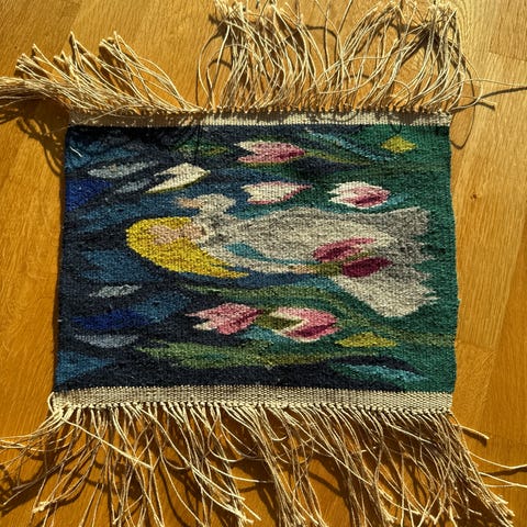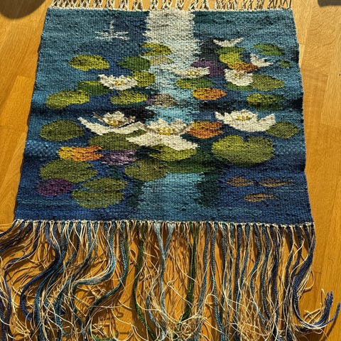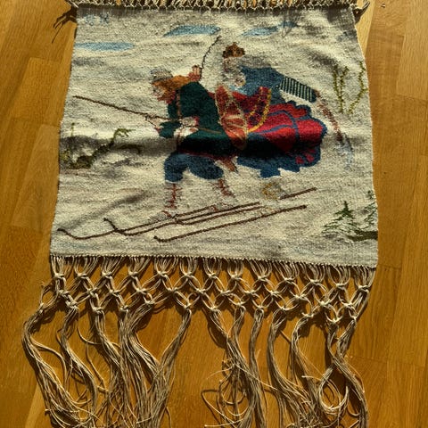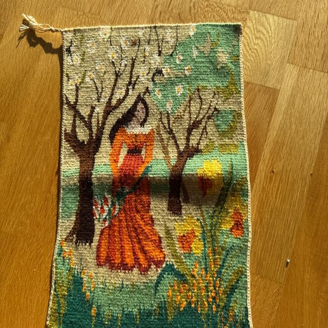 Selger et unikt brodert veggteppe, perfekt som dekorasjon i stue, soverom eller gang. Teppe er laget med nøye håndarbeid og har et tidløst design som gir varme og karakter til hjemmet.