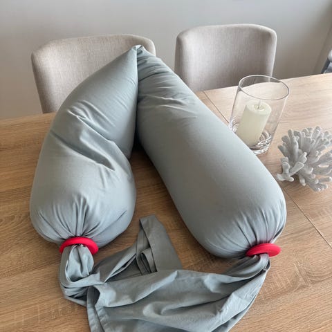 bbhugme gravidpute med oppbevaringsbag. Gravidputen er fylt med antibakterielle EPS-mikroperler og har avtagbart trekk i jersey (95 % bomull og 5 % spandex). Putens lengde er ca. 140–150 cm. Leveres i praktisk oppbevaringsbag som gjør det enkelt å lagre og ta med puten. Egnet til bruk i ulike posisjoner for støtte under graviditet, samt til amming og flaskemating.