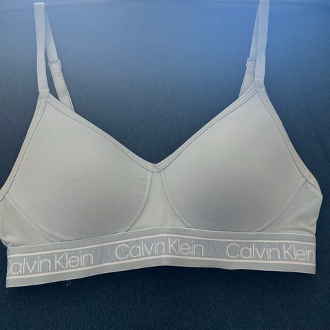 Calvin Klein i størrelse M. Den er rosa og laget i bomull. Modellen har trekantformede cuper uten bøyler. 🌸