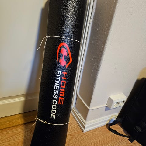 Treningsmatte i svart og grå farge. Matten har strukturert overflate med mønster på den ene siden, uttøying, yoga eller pilates. Kjøpt på Sats, da jeg hadde glemt matte.