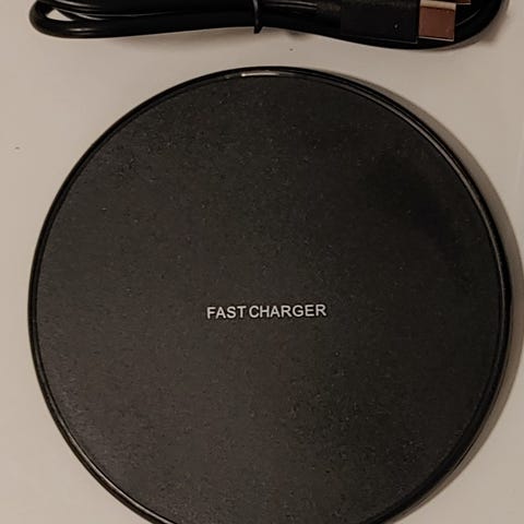 Laderen er svart og leveres med tilhørende kabel (USB-C). Egnet for enheter som støtter trådløs lading.