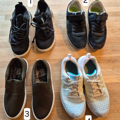 Nike joggesko unisex i størrelse 38 i svart farge. Skoene har snøring og gummisåle, og passer til hverdagsbruk og lett aktivitet for barn og unge. Det følger med to par Nike-sko i samme størrelse, begge i mørk farge med hvit Nike-logo.