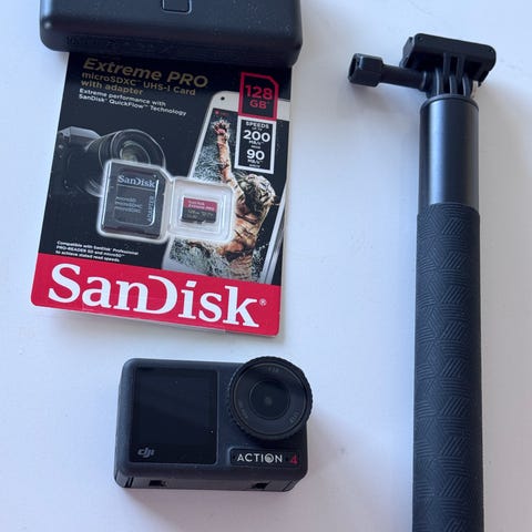 DJI Osmo Action 4 Adventure Combo med DJI Osmo action carrying bag og diverse tilbehør. Perfekt sett for noen som har lyst på et actionkamera. Kjøpt 25. januar 2025 og ganske lite brukt. Har en liten ripe i frontskjermen og selfie stangen har et lite hakk som gjør at den er litt tung å dra ut men funker helt fint