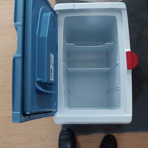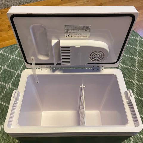 Ezetil kjøleboks i blå og hvit plast med integrert kjøleaggregat i lokket. Boksen har hjul og håndtak for enklere transport. Innvendig er det avdelere for organisering av innholdet. Lokket har eget rom for oppbevaring av ledning, og kjøleboksen har 12V-tilkobling for bruk i bil eller andre 12V-uttak. Egnet til kjøling av mat og drikke på tur, camping og reiser.