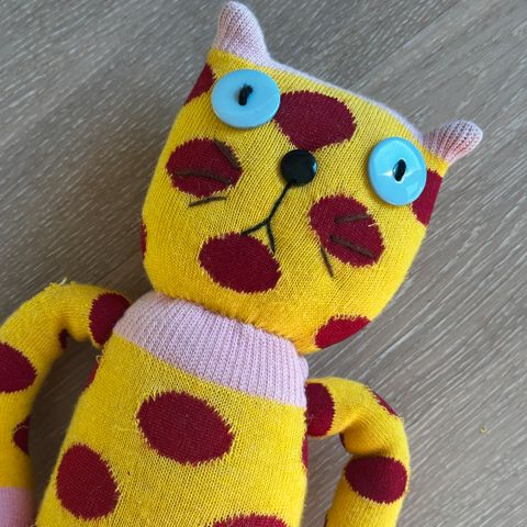 Katten er designet og håndstrikket og tilhører en gruppe på 3 katter, grå og brun. De er alle forskjellige av størrelse og utførelse,