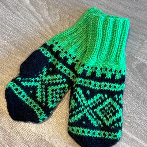 Selger votter til barn. Ca str 10 år. Ubrukt. Garnet heter nordavind. 75kr per par.