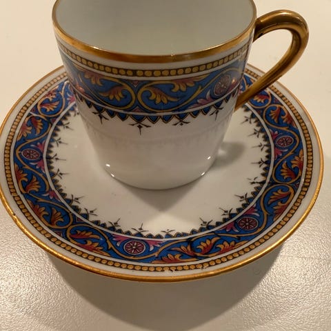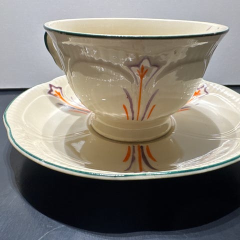 Plant porselenskopp med skål i hvitt porselen med flerfarget blomster- og mønsterdekor. Kopp og skål har dekor langs kantene i blant annet blå, rød og gullfarget tone. Begge deler er merket «Plant» under. Egner seg som kaffekopp eller tekopp med tilhørende skål.det er fra 50-60 tallet like før Plat ble solgt til Wedgwood i England