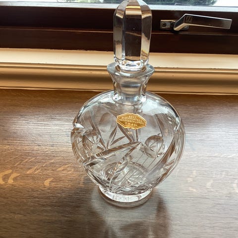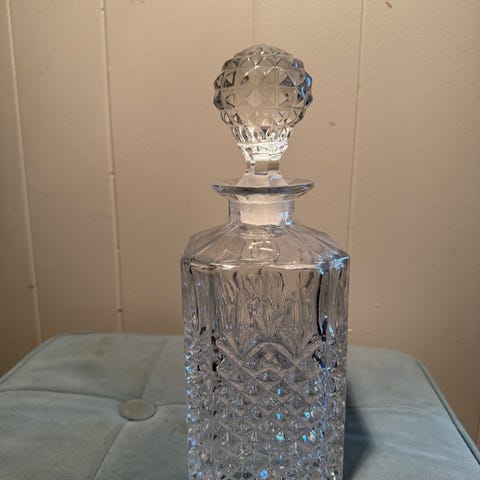 Krystall karaffel med slipet mønster og matchende fasettert kork. Karaffelen har et hengende emaljeskilt med teksten «Cognac» festet i metallkjede. Egnet til servering og oppbevaring av cognac eller annen brennevin. Passer på bord, barvogn eller i vitrineskap.