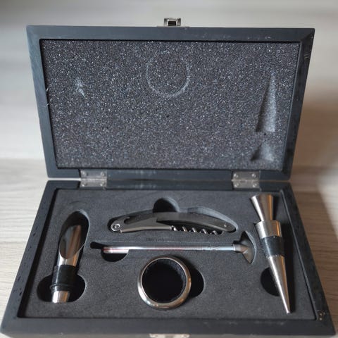 vinsett i treboks. Settet inneholder vinåpner, flaskepropp, helletut og dryppring, presentert i en rektangulær treboks med polstret innside. Egnet til oppbevaring og servering av vinutstyr hjemme eller som praktisk tilbehør til vinflasker ved servering.