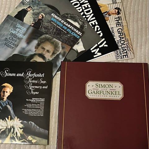 Boksen inneholder flere LP-plater med musikk av Simon & Garfunkel. På bildene vises blant annet albumene "Sounds of Silence" og filmmusikken til "The Graduate". Platene leveres i en samlet boks med omslag i burgunderrød farge. Egner seg for avspilling på platespiller som støtter LP-format (vinyl).