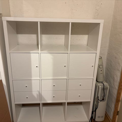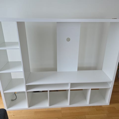 Hvit hylle. Lite brukt. 8 rom. Stødig og fin hylle. Kan også stå loddrett. Kjøpt i 2025..Må hentes. Heis i bygget. Send mld via Finn for hente-avtale.