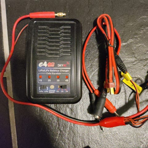 iMAX B6 batterilader med strømadapter. Laderen har display og tilkoblingskabler. Lipo balanse lader.