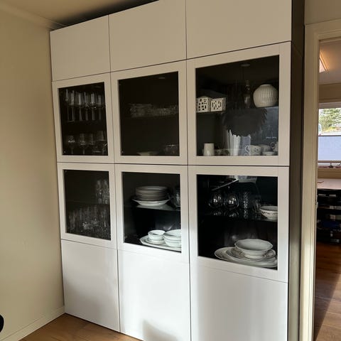 Vegghengte over- og underskap selges inkludert pen benkeplate og spotter. Relativt nytt, men selges grunnet renovering av hele kjøkkenet. Gjør seg godt som tillegg til kjøkken, evt til andre rom.