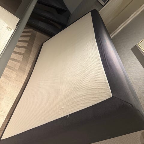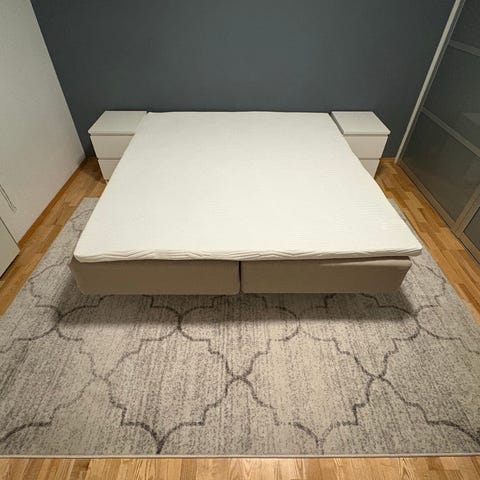 Pent brukt rammemadrass fra Ikea selges. Den er 90x200, med trebein som på bilde på 20 cm som gjør det fint for lagring under sengen. Beina kan lett tas av for enklere transport.