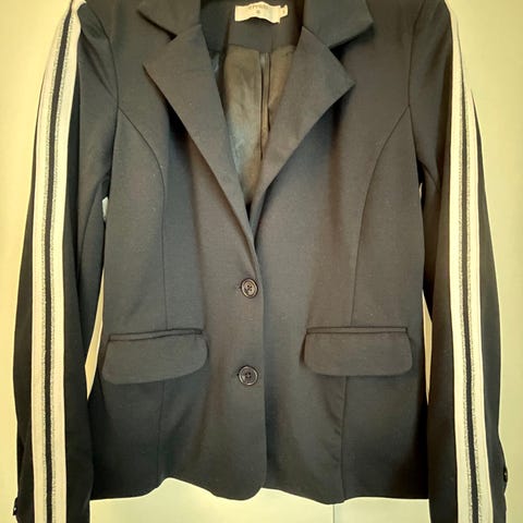 Så godt som ny jakke selges. Jakken er fra PENN&INK og er i størrelse 38. Vil si den passer best en small. Den har hvite striper langs ermene og en hvit stripe bak. Lommer på sidene. Veldig mye stretch i stoffet. Sendes mot porto.