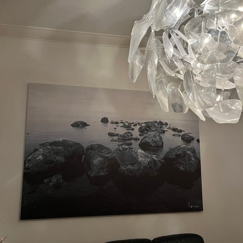 IKEA veggbilde med undervannsmotiv. Bildet viser steiner på bunnen og bølger/undervannsscene i blå og brune toner. Passer som veggdekorasjon i stue, gang, soverom eller kontor. Materiale og nøyaktige mål er ikke oppgitt av selger.