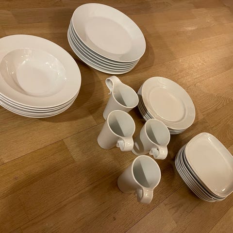 1 asjett, 1 vinglass, 2 vannglass, 2 tallerkner, 2 skåler og 2 dype tallerkner kan kjøpes i tillegg. Pris finner vi ut.