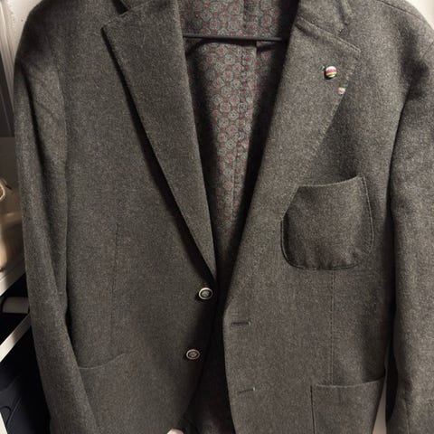 Vintage desigual patchwork blazer i str 54. 60% polyester, 35% ull, 3% bomull, 1% elastan og viskose. Fôr 100% bomull. Litt rødlig lys på jakken pga lampa:)