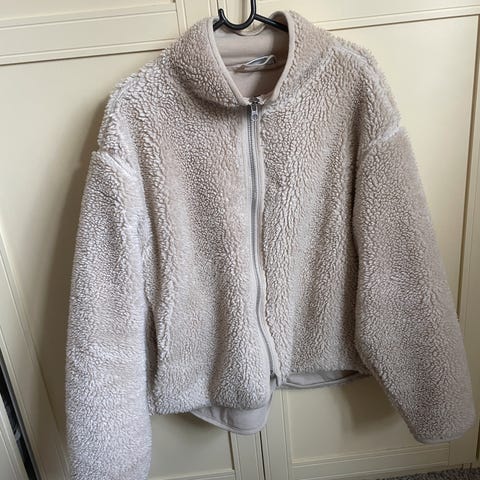 Fargen syns best på bildet av lappen med størrelsen på. Lys beige. To store lommer foran. Litt stor i størrelsen. Nyvasket.