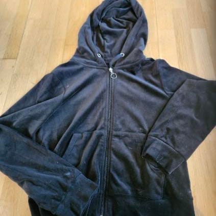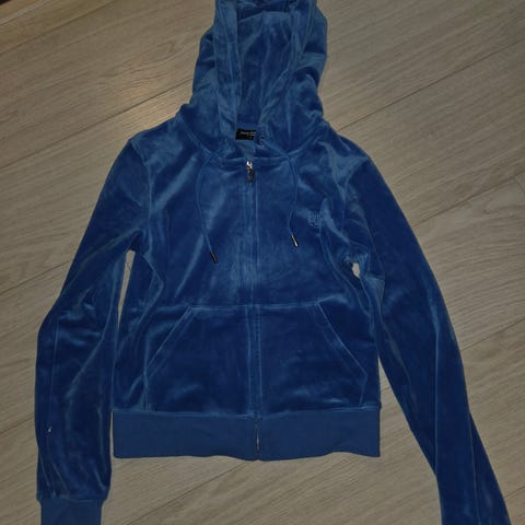 Juicy Couture hettejakke for dame i størrelse S. Jakken er blå og laget i polyester. Den har glidelås i front, hette med snøring og lommer foran. Stoffet har myk, velour-lignende overflate. Passer som hverdagsjakke eller til avslappet bruk.