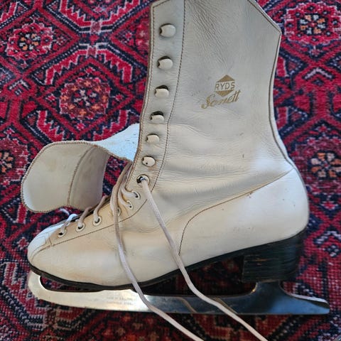 Hvite skøyter i ekte skinn, i størrelse 38. Ikke veldig store i størrelsen, vil også fint passe str 37 med et ekstra par sokker og for å ha noe å vokse i.